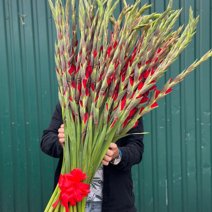 На фото букет из 49 красных гладиолусов. В составе: гладиолус 49 шт, атласная лента 1 шт, . Все цветы свежие и ароматные, букет красиво оформлен и отлично подходит для подарка. Доступна доставка цветов или самовывоз.