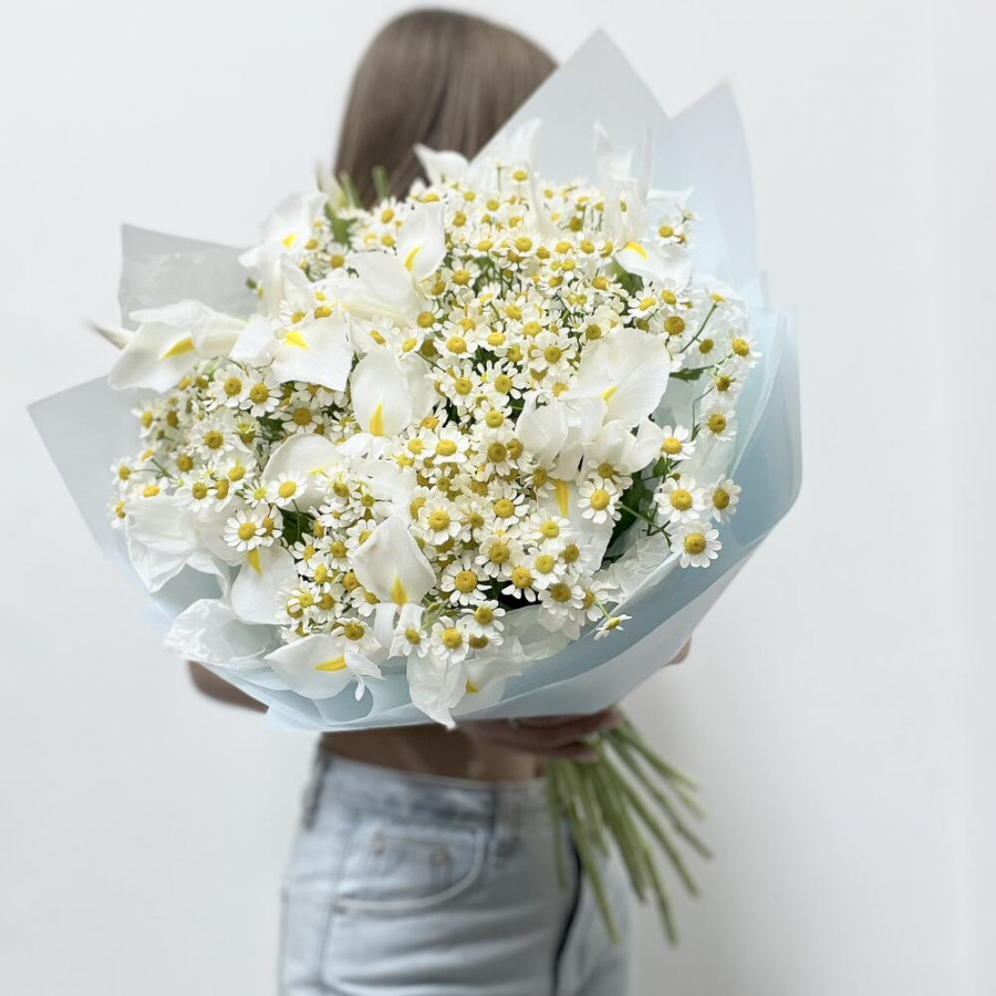 На фото букет из белых ирисов и ромашек. В составе: ирис 25 шт, танацетум 6 шт, дизайнерская упаковка 1 шт, атласная лента 1 шт, . Все цветы свежие и ароматные, букет красиво оформлен и отлично подходит для подарка. Доступна доставка цветов или самовывоз.